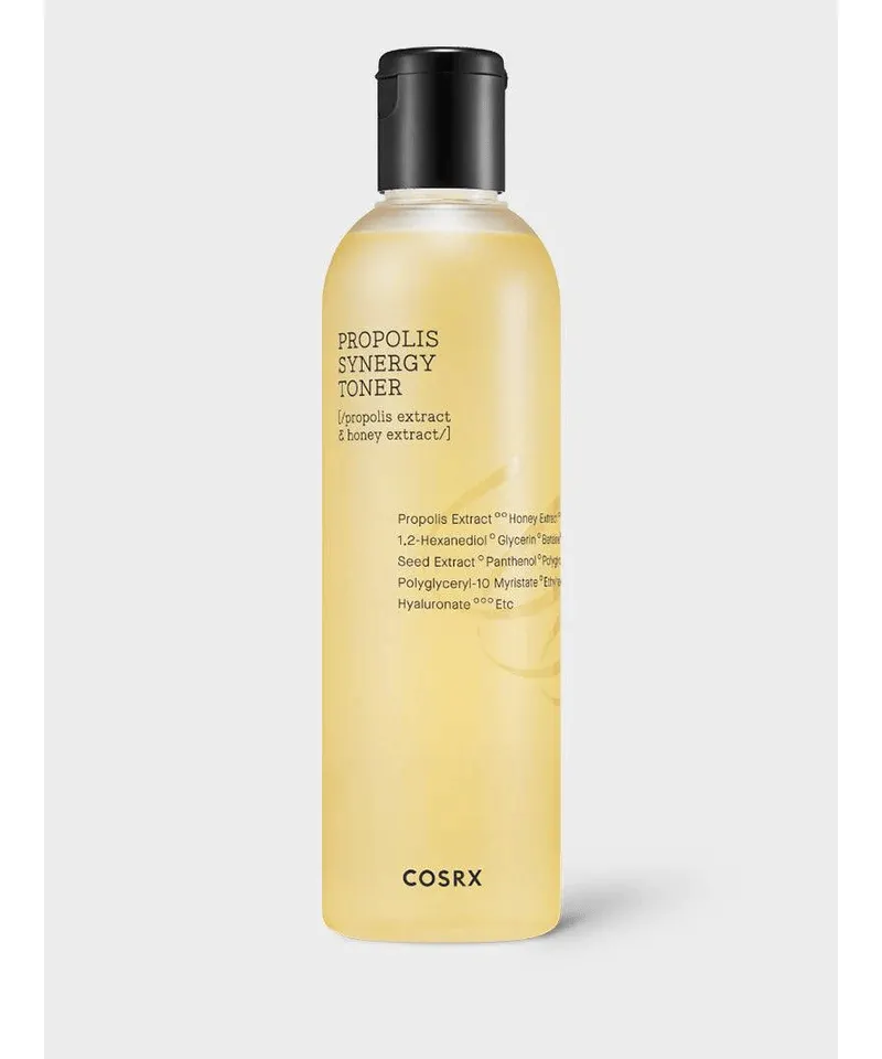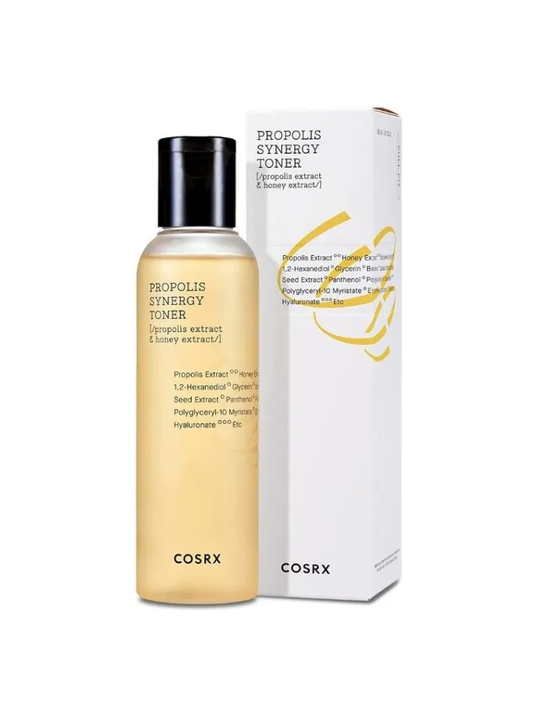 To Full Fit Propolis Synergy Toner της COSRX είναι μια τονωτική λοσιόν με 72,6% πρόπολη μαύρης μέλισσας και 10% εκχύλισμα μελιού. Προσφέρει ενυδάτωση και θρέψη στο δέρμα, βελτιώνει την υφή του και το αφήνει υγιές, λαμπερό και απαλό.